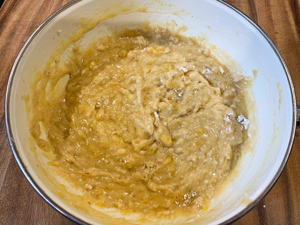 4. Add the dry ingredients into the banana mixture and stir just until combined. Do not overmix.